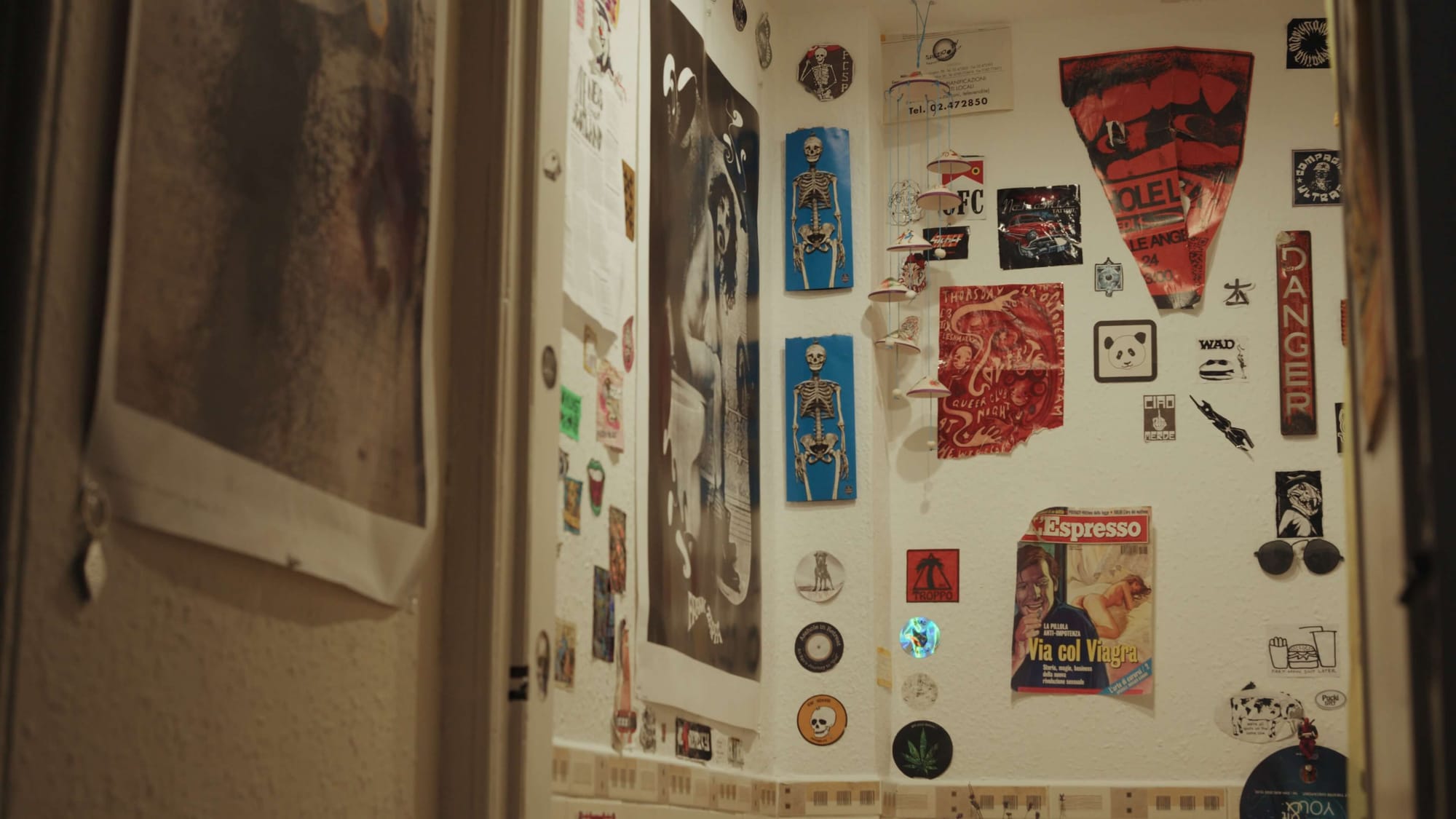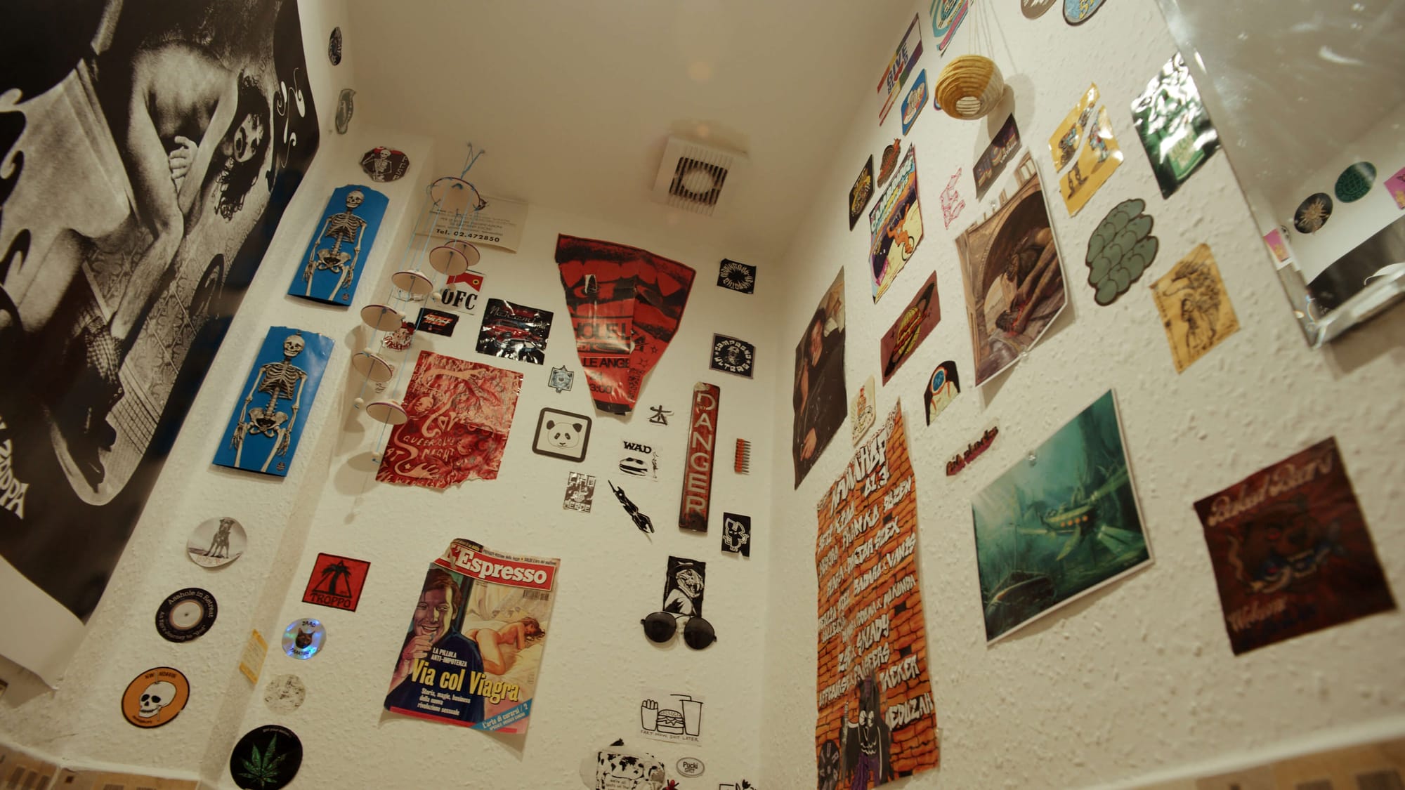 The bathroom stickers are from holidays. We got them in Budapest and Amsterdam. We’d be walking around like: oh, that one’s cool — let’s take it back — and that’s how the sticker collection grew.