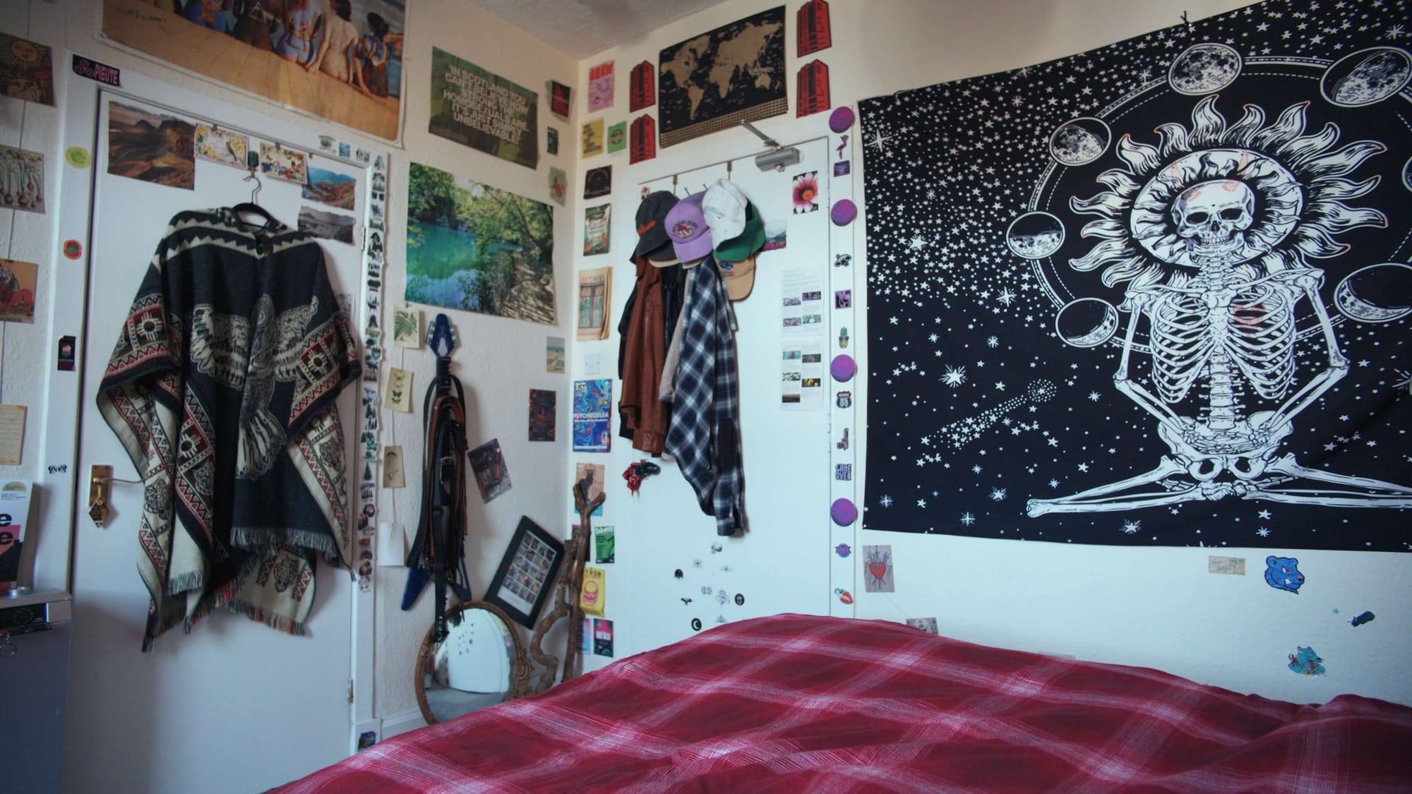 The first thing I put on the wall was my big skeleton poster. It’s a bit morbid, but it really got me through some tough times when I was living away from home in Canada. It grounded me. I remember putting it up here and being like: this is my flat.